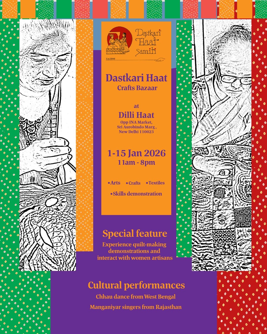 Celebrating its 40th edition, the Dastkari Haat Crafts Bazaar is a heartfelt New Year outing focused on handmade crafts, skilled artisans, and India’s living traditions. Expect Madhubani and Pattachitra art, handwoven textiles, natural skincare products, and traditional décor. Cultural performances like Chhau dance and live workshops add colour and context, making it an enriching experience for all ages.