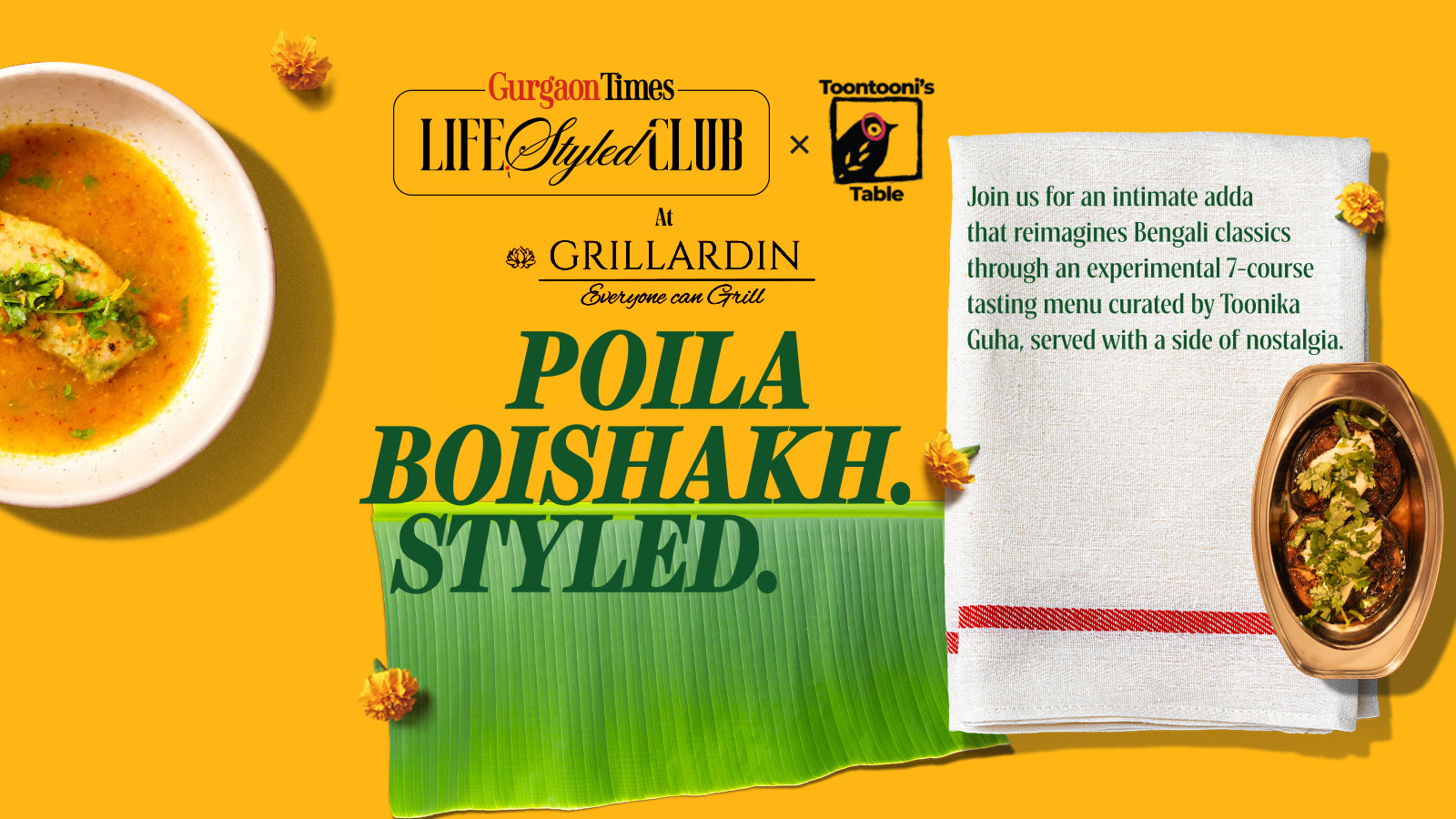 A curated fine-dining experience featuring reimagined Bengali classics presented through a 7-course tasting menu with storytelling and flavours.